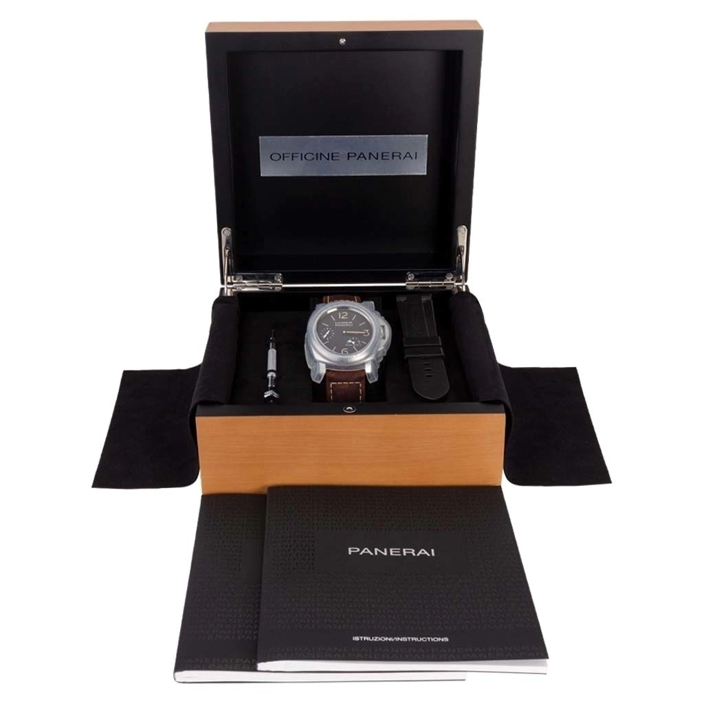 Relógio Panerai, modelo Luminor, referência PAM 00795, original, seminovo, caixa em aço medindo aproximadamente 44mm, movimento mecânico com corda automática, com reserva de marcha de 8 dias, mostrador preto com numerais árabes e marcadores de horas luminescentes, marca os segundos às 9 horas, indicador de reserva de marcha às 5 horas, com certificado original, caixa, pulseira de couro e uma de borracha, com a ferramenta para trocá-las facilmente.