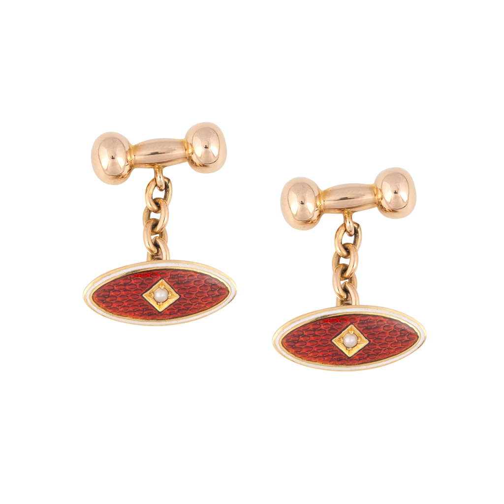 A Jardins Joias selecionou esse par de abotoaduras, seminovas, confeccionadas em ouro 14k, com esmalte, no formato oval, medindo 19mm x 8.5mm com uma micro pérola natural no centro.