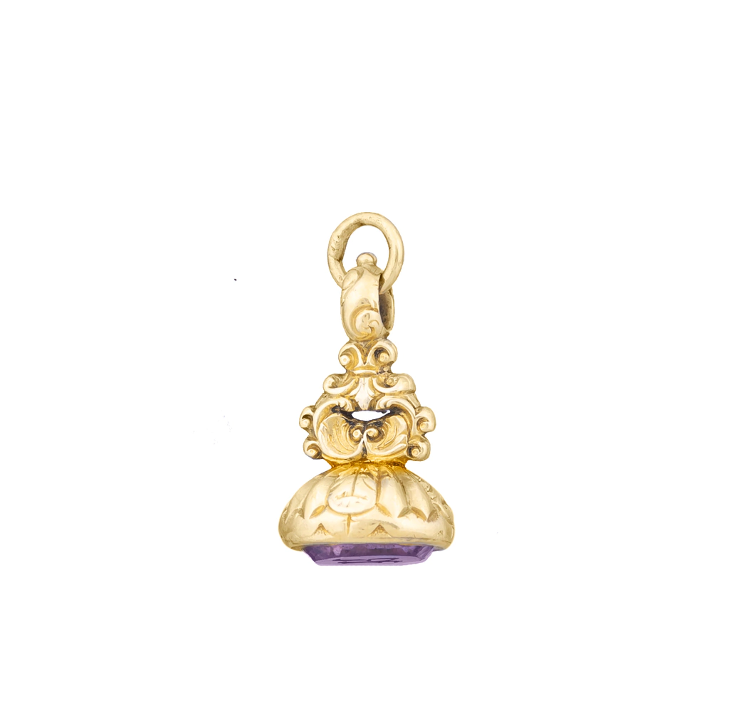 A Jardins Joias traz para você, colecionador, esse berloque sinete, da virada do século 20, de ouro 14k, com o monograma "R" gravado em baixo relevo numa pedra Ametista, medindo aproximadamente 2 cm.